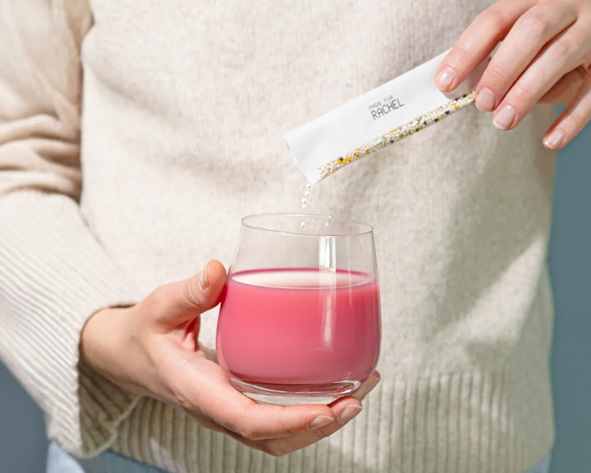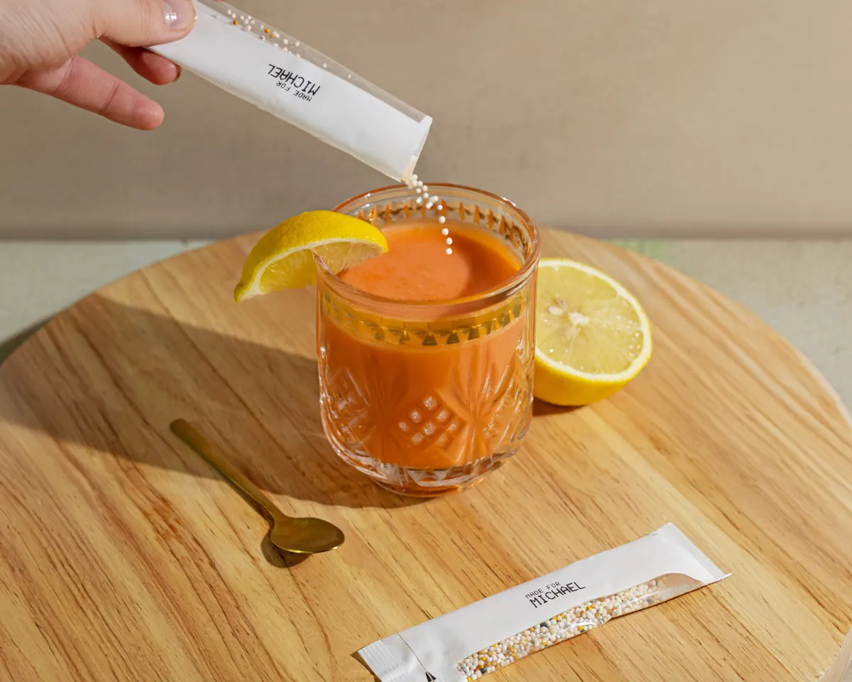 Wir haben einen Algorithmus entwickelt, mit dem wir die optimalen Mengen an den verschiedenen Mikrotransportern und damit der Nährstoffe berechnen können. Auf dieser Basis wissen wir genau, welchen Bedarf Du pro Tag hast. Unser selbst entwickeltes Abfüllgerät wiegt genau die richtige Menge der verschiedenen Mikrotransporter ab. Die individuelle Zusammenstellung wird kurz gemischt und dann in Tagesrationen verpackt.